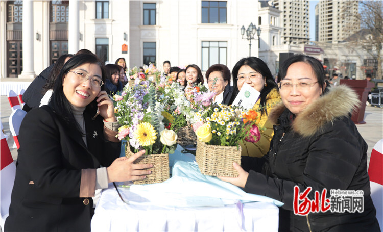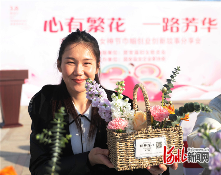 3月6日,廊坊固安縣在孔雀大湖公園廣場(chǎng)舉行巾幗創(chuàng)業(yè)創(chuàng)新故事分享會(huì)。圖為分享會(huì)活動(dòng)現(xiàn)場(chǎng)女性代表正在展示插好的花束。陳放攝