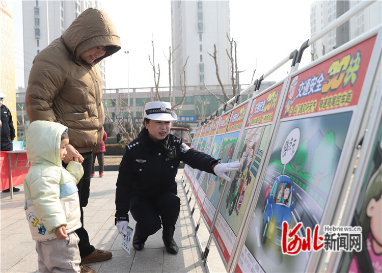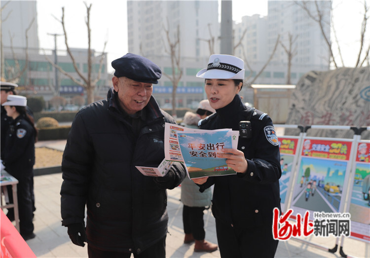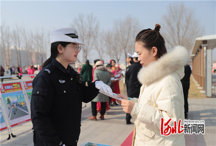 3月12日,在固安縣市民服務(wù)中心廣場,公安交警為群眾講解交通安全常識。