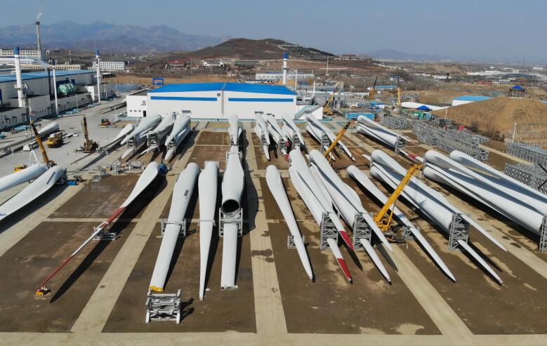 3月7日,秦皇島經(jīng)濟技術(shù)開發(fā)區(qū)一家風(fēng)電設(shè)備生產(chǎn)企業(yè)的工人在廠區(qū)工作(無人機照片)。