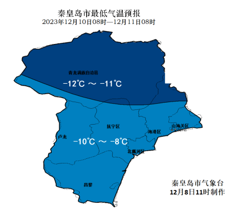 12月8日15時21分,秦皇島市氣象臺發(fā)布寒潮藍(lán)色預(yù)警:受強(qiáng)冷空氣影響,預(yù)計(jì)8日夜間到10日,秦皇島市各縣區(qū)平均氣溫將持續(xù)下降8℃至10℃,11日早晨最低氣溫北部山區(qū)-11℃至-10℃,其他地區(qū)-9℃至-7℃,請防范。