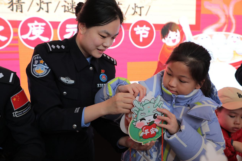 五彩繽紛的燈籠和謎題卡片懸掛在半空中,營造了濃郁的節(jié)日氛圍。謎題集知識性和娛樂性于一體,涵蓋了傳統(tǒng)文化、成語故事、生活常識等多種類別。在猜燈謎環(huán)節(jié),民警和警娃們冥思苦想、樂在其中,時而口中念念有詞,時而相互熱烈討論謎底,現(xiàn)場氛圍熱火朝天!白龌、猜燈謎、兌禮物,我和孩子感受到了來自大家庭的溫暖,非常開心,新的一年我將堅守崗位,當好國門安全忠誠守護者!眳⒓踊顒拥拿窬硎。
