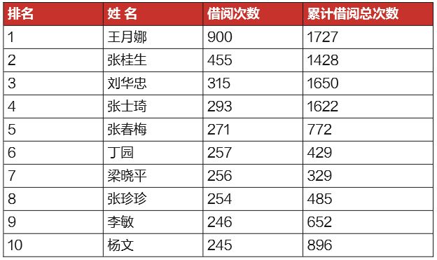 值得一提的是,今年前十名讀者的總借閱量達(dá)到了3563冊(cè),比去年增長(zhǎng)17%,排名前五位的讀者累計(jì)借閱冊(cè)數(shù)都達(dá)到了千余次。