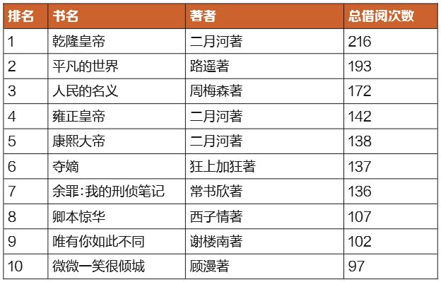 文學(xué)類(lèi)圖書(shū)借閱排行榜中,二月河的《乾隆皇帝》以總借閱量216冊(cè)次高居榜首,接下來(lái)是路遙的《平凡的世界》和周梅森的《人民的名義》。二月河成為最大贏家,除《乾隆皇帝》外,“帝王系列”中的《雍正皇帝》和《康熙大帝》分別占據(jù)了排行榜前五名中的第四名和第五名。