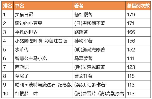 少兒類(lèi)圖書(shū)借閱排行榜上,楊紅櫻的《笑貓日記》系列以總借閱量179冊(cè)次重回榜首,日本作家黑柳徹子的《窗邊的小豆豆》位居第二,孫幼軍的《小豬唏哩呼嚕》系列熱度有所減退,位居第四。《平凡的世界》《水滸傳》《西游記》《紅樓夢(mèng)》《哈利·波特與魔法石》等國(guó)內(nèi)外經(jīng)典作品同樣深受小讀者喜愛(ài)。
