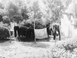 踩著腳下的生活垃圾,記者又走近了一些,發(fā)現(xiàn)有幾條繩子硬生生地勒在還不太粗的樹干上,床單、衣褲及內衣等十幾件衣物及生活用品,此時都搭在繩子上進行晾曬。