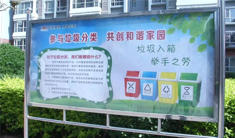 在現(xiàn)代城,欄桿、樹木、冬青上掛滿了垃圾分類的宣傳條幅,每個(gè)單元樓內(nèi)、門口都設(shè)置了垃圾分類宣傳牌和公示牌。小區(qū)居民也在不斷將垃圾分類融入自己的生活中!