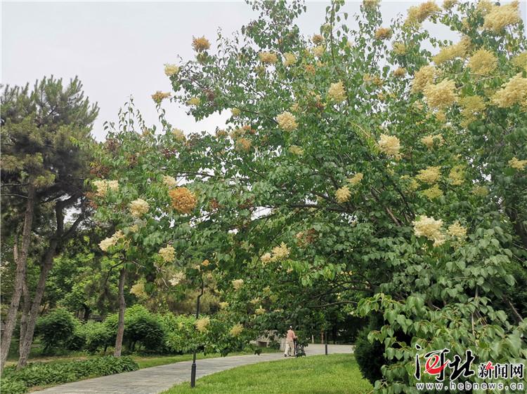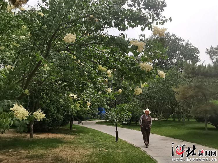 走近看,是少見的暴馬丁香。暴馬丁香的樹干是從根部就開始分開的灌木的樣子,植株卻比普通灌木高很多,特有的花香也是這滿樹白花散發(fā)出來的。這片暴馬丁香守著個園路的小岔口,東面是游樂場,過往的游人走到此,都忍不住念叨:“這是什么花啊,每年夏天都開,可真香啊!