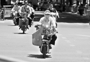 烈日暴曬下,市民“全副武裝”遮陽(yáng)。記者郄磊攝