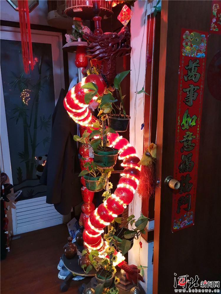 劉大爺在用酒瓶制作工藝品時(shí),都會(huì)預(yù)先好好琢磨琢磨,怎樣用最合適的酒瓶制作最出彩的作品?吹郊t色的酒瓶后,劉大爺便想著制作一款有吉祥如意寓意的工藝品,于是25個(gè)紅色酒瓶組成了一款龍燈。將龍燈點(diǎn)亮之后,紅彤彤的龍燈照得屋里也喜氣洋洋。張大媽告訴記者,每當(dāng)過年的時(shí)候,來串門拜年的親朋好友都會(huì)圍著龍燈照相,“特別有過年氣氛”,張大媽笑著說。
