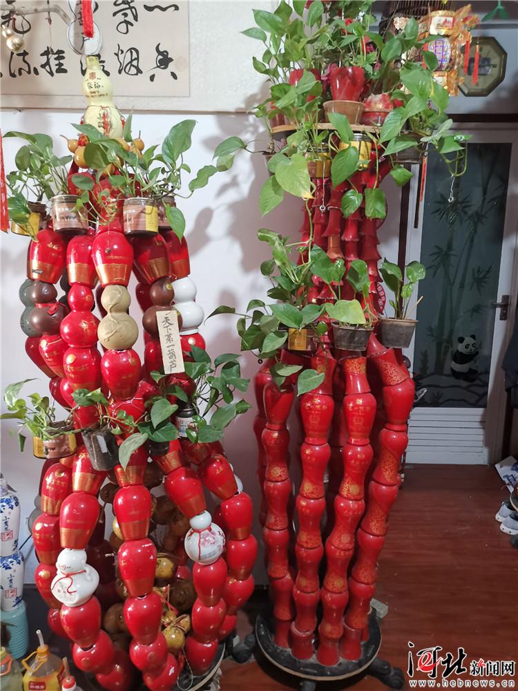 94個(gè)酒瓶組成的火箭模型高達(dá)2.59米,25個(gè)酒瓶組成的龍燈點(diǎn)亮之后紅彤彤喜氣洋洋,106個(gè)葫蘆形酒瓶組成的巨型“寶葫蘆”造型巧妙又有好寓意……走進(jìn)省會(huì)86歲老人劉明錦家,各種由廢舊酒瓶制作的工藝品令人眼花繚亂。變廢為寶,將空酒瓶化身工藝品予其以新的生命,劉大爺從中自得其樂。