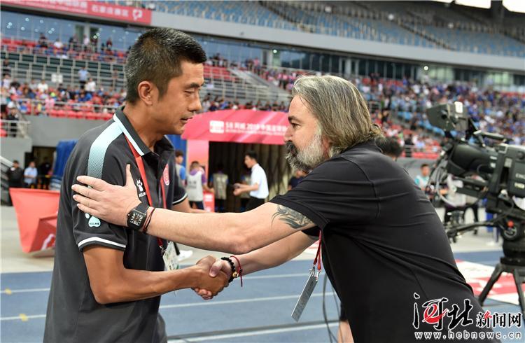 6月22日,石家莊永昌亞森(右)在賽前與四川FC主教練張重光握手。記者耿輝攝