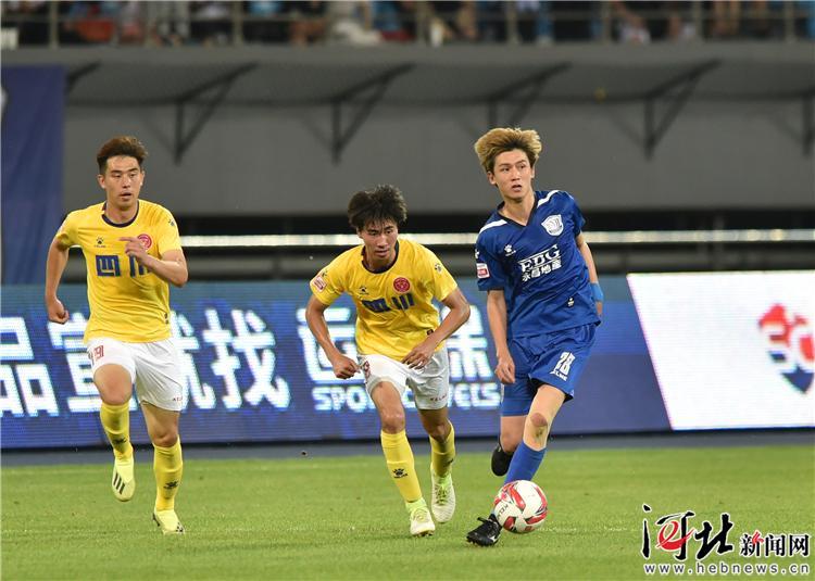 6月22日,石家莊永昌28號詹敏偉(右一)在比賽中帶球突破。記者耿輝攝