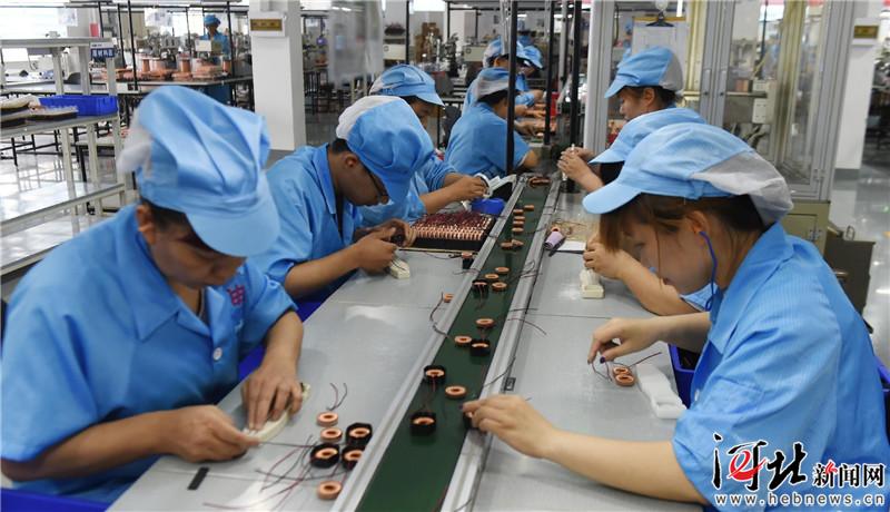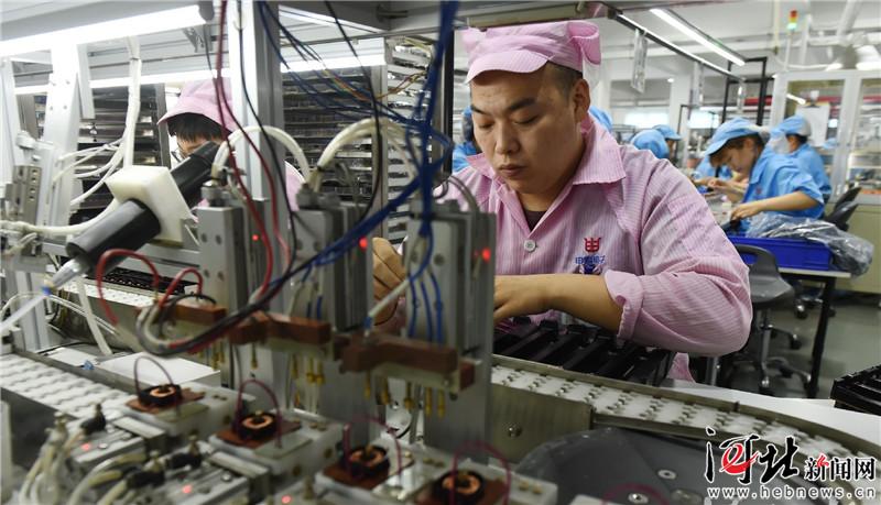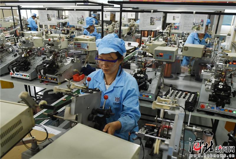 7月8日,在辛集市河北申科電子股份有限公司生產(chǎn)車間,工作人員在裝配精密微型電流互感器。