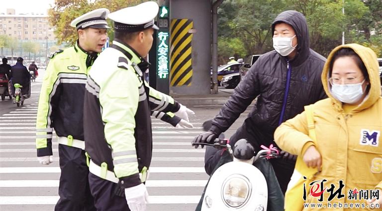 11月7日上午10時30分,記者來到槐安路與育才街交叉口,跟隨裕華交警大隊民警對非機(jī)動車、行人交通違法行為進(jìn)行專項整治。在現(xiàn)場記者看到,路口西側(cè)的斑馬線上不斷有電動車從南向北疾馳而過,民警將他們一一攔停!澳鷳(yīng)當(dāng)靠右行駛,您現(xiàn)在這是逆行,違反交通法律法規(guī),請您到這邊按規(guī)定交一下罰款!痹诿窬闹甘鞠,違法市民將電動車推放到不影響通行的位置,民警對他們進(jìn)行了批評教育,也耐心為不明所以的市民進(jìn)行解釋說明。