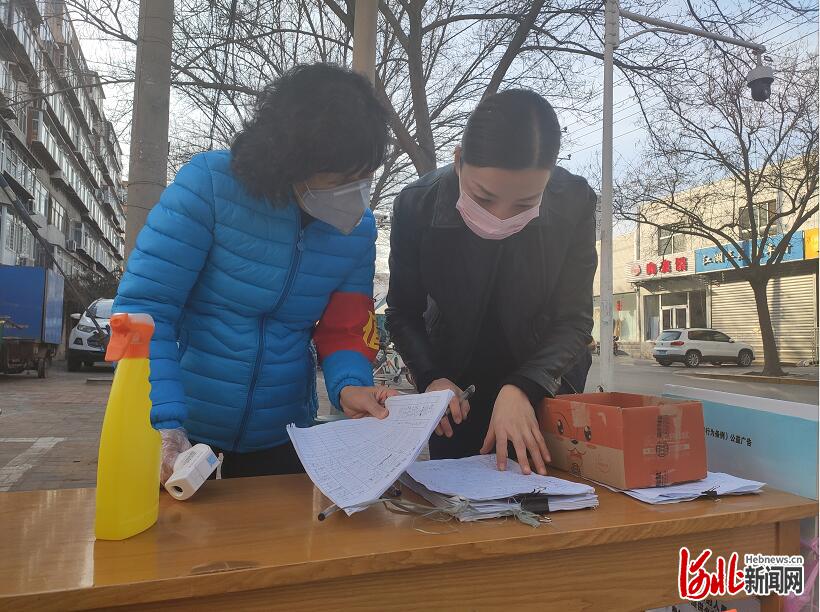 張曉(右)在變電街社區(qū)北苑小區(qū)門口防控點查看登記情況。