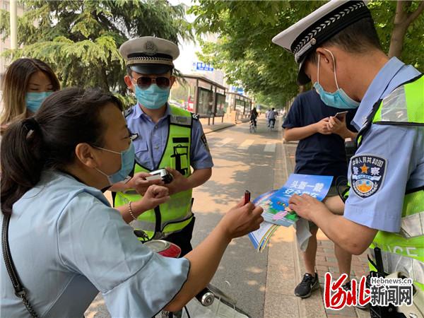 5月21日,河北石家莊裕華交警大隊(duì)在裕華路與富強(qiáng)大街交口進(jìn)行電動(dòng)自行車佩戴安全頭盔查糾宣傳活動(dòng)。圖為查究宣傳現(xiàn)場。