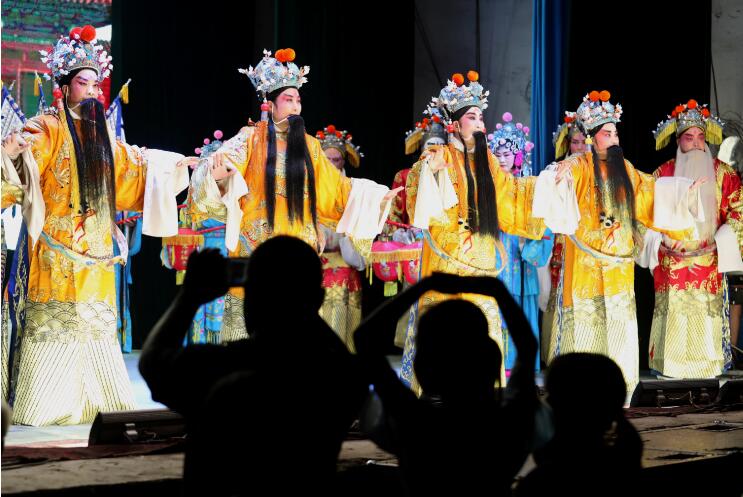 8月5日,在河北省石家莊市井陘縣上安鎮(zhèn)頭泉村的村民文化廣場,井陘晉劇院戲曲演員在進(jìn)行晉劇聯(lián)唱演出。 新華社發(fā)(梁子棟攝)