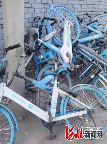 在石家莊市開發(fā)區(qū)北莊住宅區(qū)附近,筆者發(fā)現(xiàn)數(shù)十輛沾滿塵土、且有不同程度破損的哈啰單車或橫七豎八地疊放在一起,或被?吭趬。路過的王先生告訴筆者,這些單車堆在這里至少得有一個多月了,很多車都壞了,不能騎,堆放在這里也一直沒見有人過來收攬整理!懊看纬鲩T路過這里,看到這些共享單車都覺得挺鬧心的,太影響市容市貌了!”