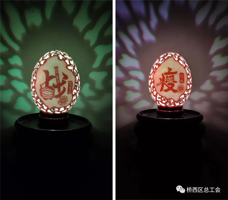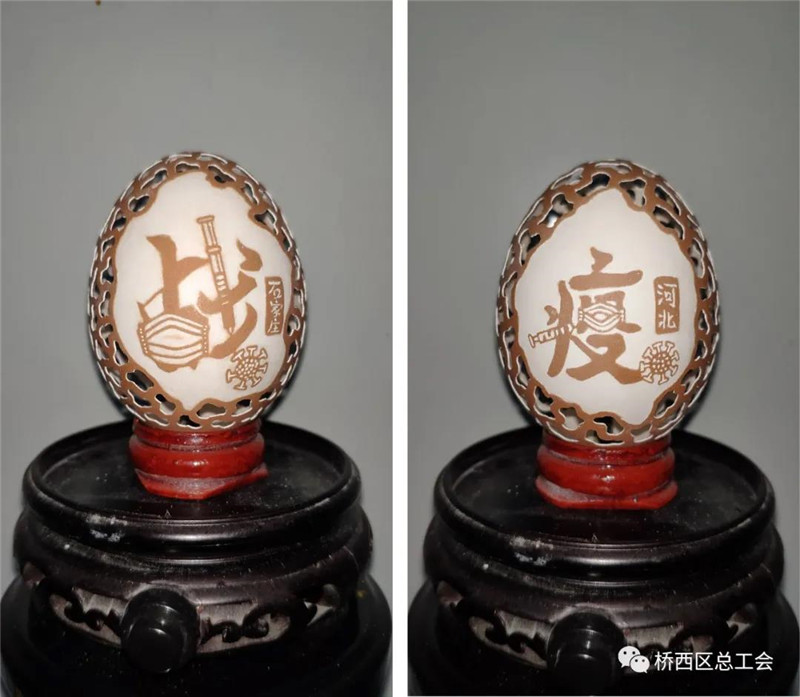 張曉賀是河北省石家莊市橋西區(qū)非遺蛋雕代表性傳承人,他積極響應(yīng)號召,早早把開在橋西區(qū)友誼街道誼北路上的非遺文化蛋雕工作室關(guān)停,在居家抗疫的日子里,他秉承匠人精神,不忘利用手中的“武器”,以藝戰(zhàn)“疫”。希望通過自己的作品,凝聚起人民群眾抗擊疫情的強(qiáng)大精神力量,助力石家莊人民戰(zhàn)勝疫情,重啟美好新生活。