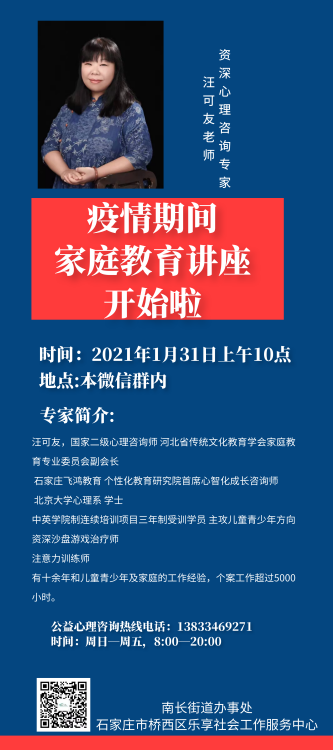 河北新聞網(wǎng)訊(王麗萍、陳立娟)疫情防空期間,為了緩解大家的長期封閉生活造成的心理壓力,同時給予家長特殊時期的家庭教育指導,1月31日10時,在南長街道黨工委的大力支持下,馬艷茹副主任網(wǎng)上連線石家莊飛鴻教育個性化教育研究院心智化成長心理咨詢專家汪可友,給家長及孩子們上了一堂生動有趣又發(fā)人深省的家庭教育課。