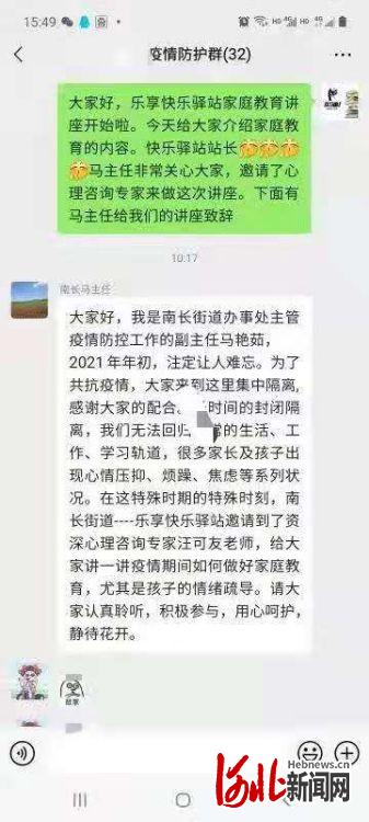 據(jù)了解,為了緩解未成年孩子及家長在疫情防控期間的心理壓力,南長街道辦事處聯(lián)合石家莊樂享社工組建了以馬艷茹副主任為站長,以專業(yè)社工服務隔離期兒童及家長的項目——樂享快樂驛站,在心理疏導、親子關系、經(jīng)典誦讀等方面發(fā)揮了重要作用。