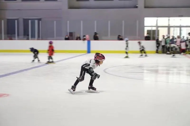 在滑冰館的賽道上,選手們拼搏奔跑、你追我趕、爭當(dāng)?shù)谝。來自不同協(xié)會和俱樂部的50多名選手參賽交流,賽事根據(jù)年齡共設(shè)U8、U10、U12三個組別,參賽選手從5歲到13歲不等。