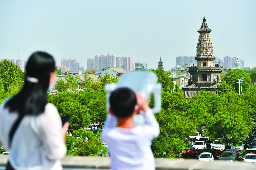 “五一”期間,正定縣在做好常態(tài)化疫情防控的基礎(chǔ)上,策劃組織了豐富多彩的“五一”假期文化盛宴?辞旯沤,品民俗風(fēng)情,賞璀璨夜景,常山戰(zhàn)鼓、榮國府實(shí)景演出、動(dòng)漫巡游等節(jié)目輪番上演,讓游客在歡樂中感受古城古韻。圖為5月4日,游客在正定南城門的城墻上用望遠(yuǎn)鏡眺望古城古塔。記者張曉峰攝