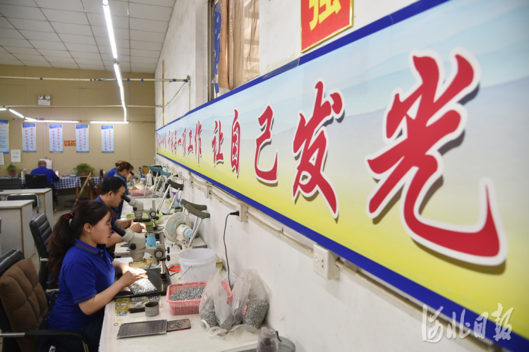 2021年5月13日,檢驗(yàn)車間內(nèi),張英花(左一)在外形鏡檢崗位認(rèn)真工作。 河北日?qǐng)?bào)記者趙海江攝