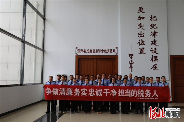 圖為深澤縣稅務(wù)局黨員干部在縣反腐倡廉警示教育基地留影紀(jì)念。苑博攝