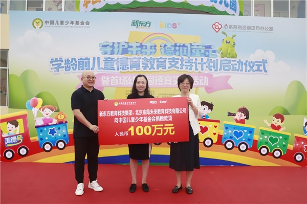 新東方教育科技集團(tuán)黨委書記關(guān)睿和北京布局未來教育科技有限公司總裁柴明一,共同向中國(guó)兒基會(huì)“學(xué)齡前兒童德育教育支持計(jì)劃”公益項(xiàng)目捐贈(zèng)100萬元。