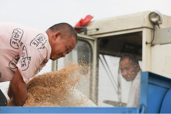 在趙縣萬畝麥田里,在滾滾麥浪中,收割機(jī)來回穿梭,演奏出一首首豐收的歡歌,農(nóng)民們搶收小麥,確保顆粒歸倉。(攝影:朱濤、姚素蕊、楊輝娟)