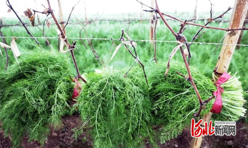 “園區(qū)葡萄間種十五畝茴香,既不耽誤葡萄的生長,也能額外增加一份收入!狈N植戶耿蕊雪說,后莊頭村大棚種植的茴香苗是與葡萄套種的,這種種植方式能夠充分利用空間,延長后季作物的生長季節(jié),提高年總產(chǎn)量,最大化提高土地利用率,增加收入。茴香苗畝產(chǎn)達(dá)4000斤,每畝可增加7000元左右的收入,主要銷往邢臺(tái)地區(qū),有固定客戶,收入穩(wěn)定。
