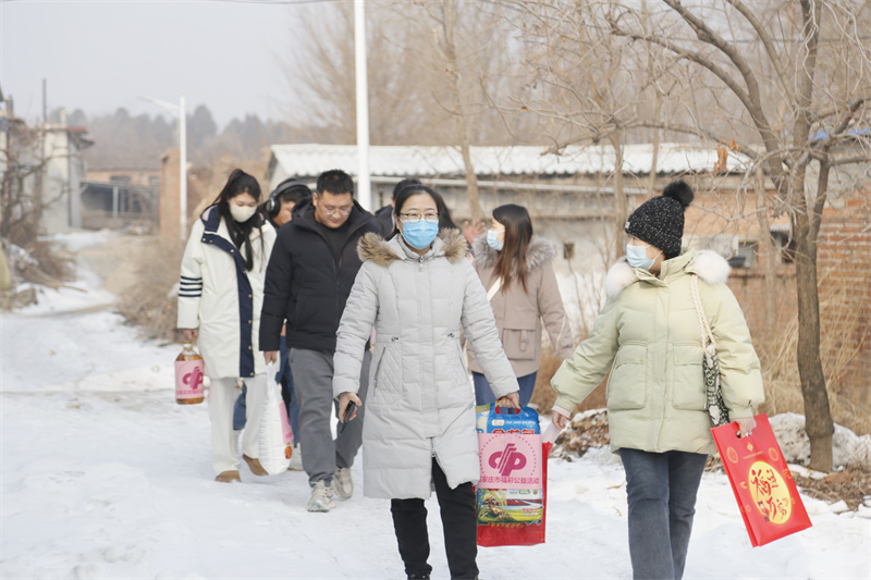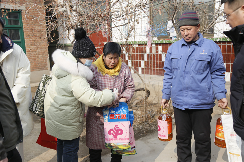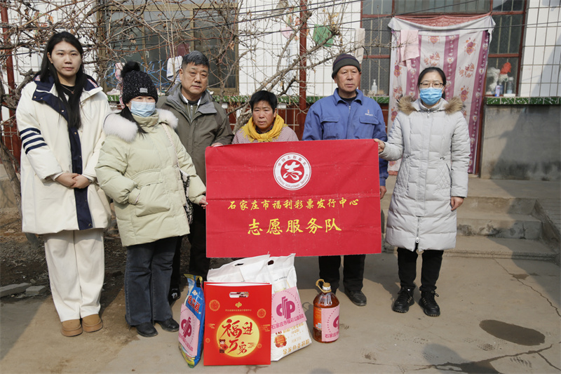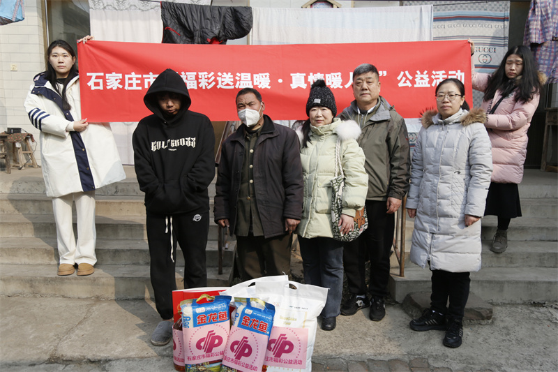 “我們是石家莊市福彩中心的,快過年了,來家里看看、拜個早年!彼团》株牭墓ぷ魅藛T把帶來的米面和花生油拎進(jìn)院子里,還送上了福字和春聯(lián)。