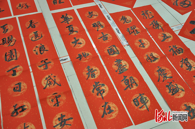 活動(dòng)當(dāng)天,幾位書法家現(xiàn)場揮毫潑墨,為到場民警及服刑人員書寫春聯(lián)、福字,送上新春的祝福。短短兩個(gè)小時(shí),書法家們一氣呵成,書寫了100多副春聯(lián)和100多個(gè)“!弊,讓在場人員連連稱贊。
