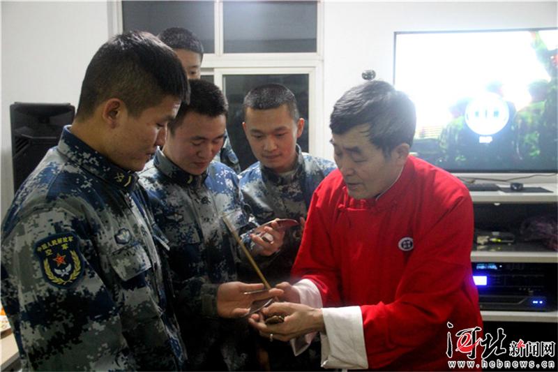 1月12日,樂亭大鼓表演藝術(shù)家張近平(右)指導(dǎo)駐地戰(zhàn)士學(xué)習(xí)樂亭大鼓的擊板技巧。 通訊員趙翠婷攝