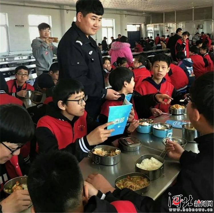 3月25日,唐山市豐潤區(qū)公安局在全區(qū)組織開展“進校園、搞宣傳、教技能、提能力,共筑平安校園”主題宣傳日活動。圖為民警利用午餐時間向?qū)W生講解安全知識。 唐山市豐潤區(qū)公安局供圖