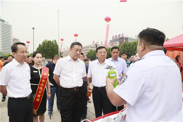 來(lái)自路南區(qū)和路北區(qū)的腰鼓隊(duì)和鑼鼓隊(duì)用一陣陣激蕩人心的鼓點(diǎn)敲響了活動(dòng)啟動(dòng)的樂(lè)章。唐山市委常委、常務(wù)副市長(zhǎng)付振波,唐山市政府副秘書(shū)長(zhǎng)崔敬學(xué)在唐山市安委辦主任、唐山市應(yīng)急管理局黨組書(shū)記張寶才和唐山市安委辦主任、唐山市應(yīng)急管理局局長(zhǎng)于興維的陪同下參與了宣傳活動(dòng)。到達(dá)現(xiàn)場(chǎng)后,付振波來(lái)到了廣場(chǎng)應(yīng)急管理業(yè)務(wù)咨詢(xún)區(qū),認(rèn)真參觀了各單位安全生產(chǎn)與應(yīng)急管理工作宣傳展板,一邊聽(tīng)取各單位負(fù)責(zé)人的介紹,一邊就感興趣的問(wèn)題向工作人員頻頻提問(wèn)!斑@是最新型的逃生緩降器,可以在火災(zāi)現(xiàn)場(chǎng)利用它安全著陸,避免發(fā)生危險(xiǎn)!痹谙榔鞑恼故緟^(qū),付振波拿起面前的逃生緩降器,用力拉了拉伸出的繩索,隨后又?jǐn)Q亮了一支多功能安全應(yīng)急手電筒。聽(tīng)完工作人員介紹最新型安全應(yīng)急器材的性能和優(yōu)點(diǎn)后,付振波不住點(diǎn)頭,與隨行人員交流著配備應(yīng)急裝備器材的重要性。
