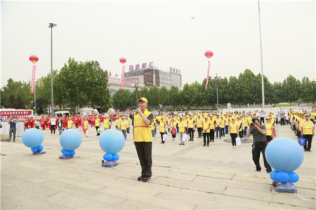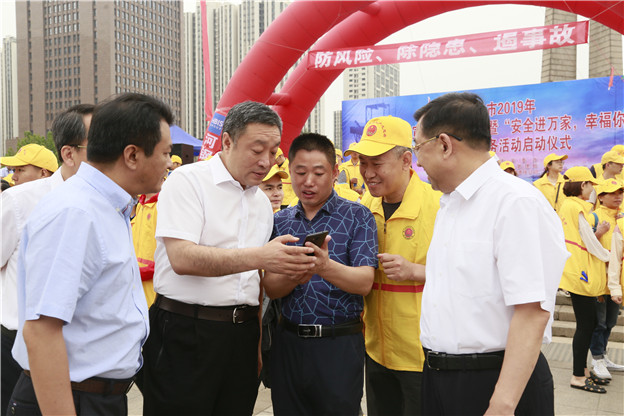 參觀結(jié)束后,唐山市“安全進(jìn)萬(wàn)家,幸福你我他”主題志愿服務(wù)活動(dòng)啟動(dòng)儀式正式開(kāi)始。廣場(chǎng)上180名來(lái)自全市各單位、各重點(diǎn)企業(yè)的安全生產(chǎn)志愿者們整齊列隊(duì),飄灑的細(xì)雨無(wú)法熄滅大家的激情,在志愿者代表從副市長(zhǎng)付振波手中接過(guò)志愿服務(wù)主題隊(duì)旗后,志愿者們高舉右拳,面對(duì)隊(duì)旗莊嚴(yán)宣誓,表達(dá)了“服務(wù)大局、奉獻(xiàn)社會(huì)、溫暖他人、彰顯愛(ài)心”的堅(jiān)定決心。隨后,付振波宣布活動(dòng)正式啟動(dòng),參加活動(dòng)的領(lǐng)導(dǎo)們按下活動(dòng)啟動(dòng)球,無(wú)數(shù)只彩色氣球隨之飄向天空,預(yù)示著唐山市“安全進(jìn)萬(wàn)家,幸福你我他”主題志愿服務(wù)活動(dòng)正乘風(fēng)而起,飛向全市各個(gè)角落,將安全生產(chǎn)、護(hù)佑平安的愛(ài)心灑向整個(gè)鳳凰城。唐山市安委辦主任、市應(yīng)急管理局書(shū)記張寶才作了動(dòng)員講話(huà),希望廣大志愿者們用愛(ài)心傳承文明、用真情奉獻(xiàn)社會(huì)、用行動(dòng)捍衛(wèi)誓言,為建設(shè)國(guó)際化沿海強(qiáng)市作出新的貢獻(xiàn),更為迎接建國(guó)70周年偉大歷史時(shí)刻營(yíng)造安全穩(wěn)定的社會(huì)環(huán)境。付振波高度關(guān)注全市安全素質(zhì)提升工作。6月16日,是2019年全國(guó)“安全生產(chǎn)月”危化品及全民安全應(yīng)急知識(shí)競(jìng)賽進(jìn)行的第16天,是河北省“中國(guó)人壽財(cái)險(xiǎn)杯”應(yīng)急知識(shí)網(wǎng)絡(luò)競(jìng)賽活動(dòng)首日,為帶動(dòng)和動(dòng)員全市各單位干部職工及廣大市民積極參與答題活動(dòng),傳播安全生產(chǎn)理念,積極普及應(yīng)急知識(shí),付振波現(xiàn)場(chǎng)用手機(jī)參與了河北省和全國(guó)網(wǎng)絡(luò)答題,為全市保持競(jìng)賽領(lǐng)先地位躬親示范。啟動(dòng)儀式后,志愿者們立即分成多個(gè)隊(duì)伍,深入萬(wàn)達(dá)廣場(chǎng)、百貨大樓及附近小區(qū)分發(fā)宣傳資料,將安全生產(chǎn)知識(shí)送到群眾手中。
