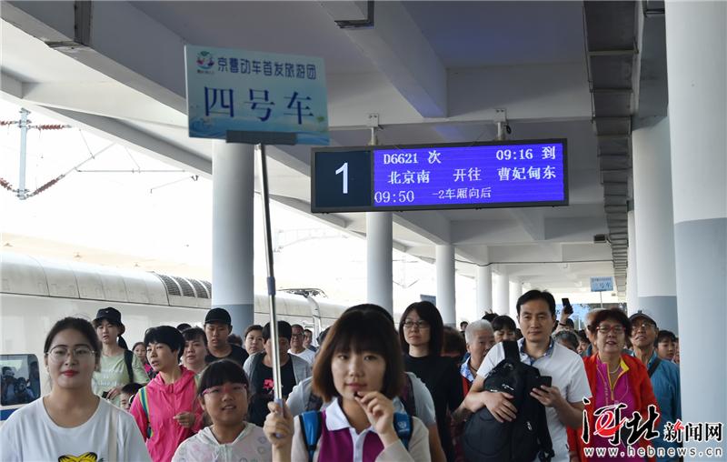 8月21日,京曹首發(fā)動(dòng)車旅行團(tuán)的游客走下列車。 記者趙海江攝