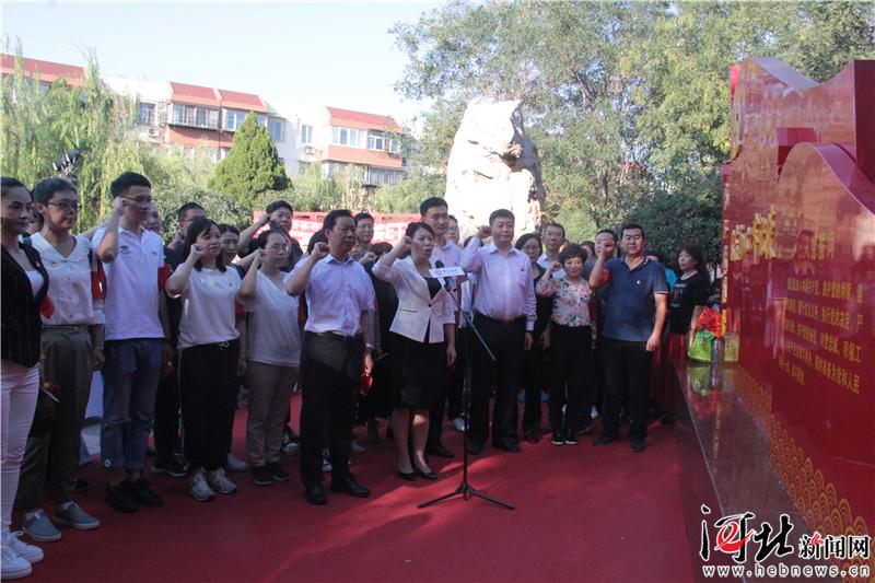 9月25日,唐山祥富里社區(qū)舉辦廣場舞大賽暨黨員進社區(qū)主題活動。圖為社區(qū)黨員重溫入黨誓詞。