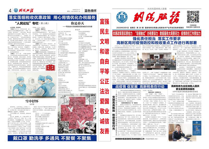 新冠肺炎疫情發(fā)生以來,該局應(yīng)時輯印了《納稅服務(wù)—戰(zhàn)“疫”特刊》,第一版重點設(shè)立《戰(zhàn)疫情 促發(fā)展 高新稅務(wù)在行動》欄目,集中反映高新稅務(wù)內(nèi)防內(nèi)控、聯(lián)防聯(lián)控,拓展“非接觸式”辦稅繳費,營造安全、高效辦稅環(huán)境等重點工作;第二、三版重點設(shè)立《戰(zhàn)“疫”稅費政策》欄目,重點匯集當下最新稅收政策、最新服務(wù)舉措;第四版重點設(shè)立《抗“疫”論壇》《戰(zhàn)“疫”防護知識》《戰(zhàn)“疫”書法、繪畫、詩歌》等欄目,弘揚正能量,歌頌“白衣天使”“奮戰(zhàn)在抗‘疫’一線的勇士”。