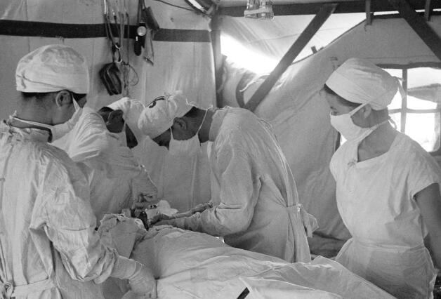 人民解放軍某醫(yī)院的醫(yī)務(wù)人員在唐山地震災(zāi)區(qū)施行手術(shù),搶救危重傷員。(1976年8月1日發(fā))新華社記者肖翔攝