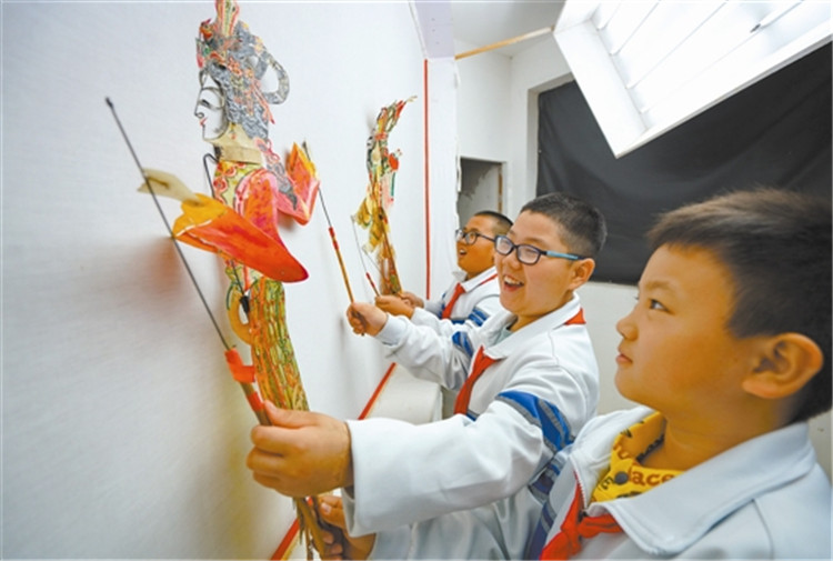 10月19日,小學(xué)生們?cè)谥袊?guó)灤州皮影博物館內(nèi)練習(xí)皮影人操作。