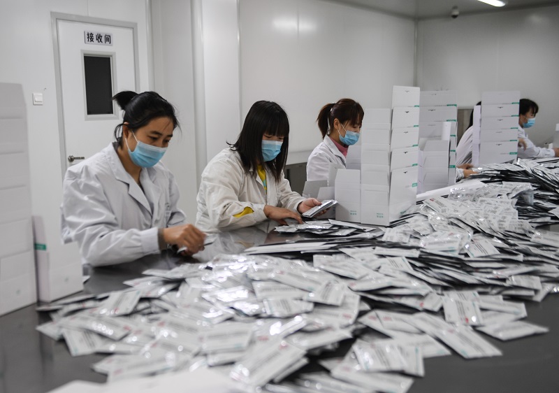 圖為英諾特(唐山)生物技術(shù)有限公司的工人們正在裝運捐贈的檢測試劑盒 河北日報通訊員陳儒、梁玉水?dāng)z