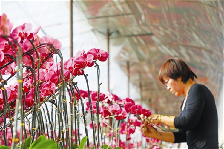 春節(jié)臨近,東清水村蝴蝶蘭種植基地20多個(gè)品種、3萬(wàn)多盆蝴蝶蘭進(jìn)入盛花期,花農(nóng)忙著組裝盆花外運(yùn)銷(xiāo)售,以滿足春節(jié)市場(chǎng)需求。 張永新攝影報(bào)道