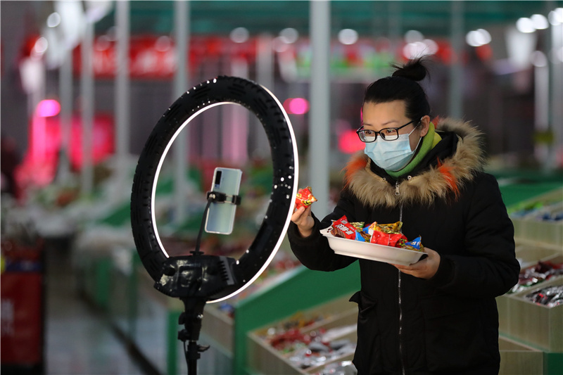 2月8日,在河北省唐山市海港經(jīng)濟(jì)開發(fā)區(qū)年貨市場(chǎng),工作人員在線上直播銷售春節(jié)飾品。