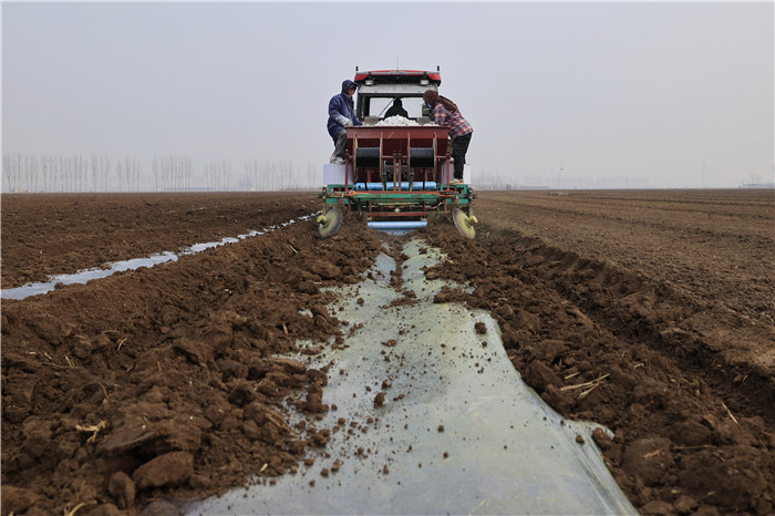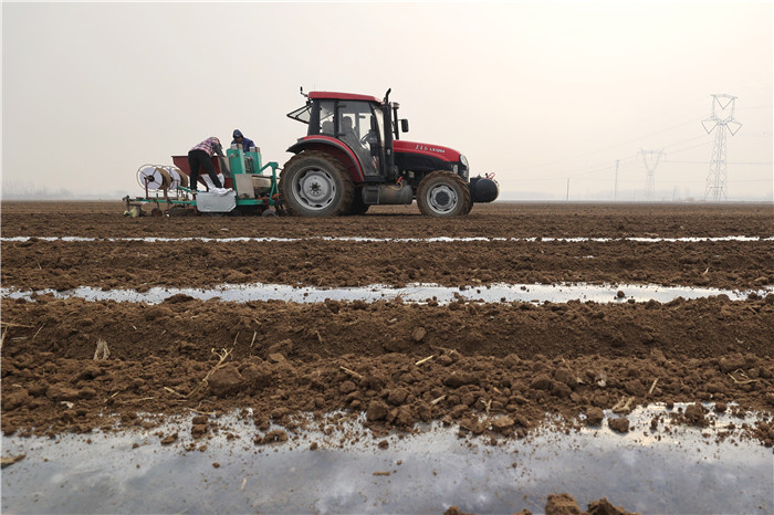 3月11日,河北省唐山市豐南區(qū)小集鎮(zhèn)起莊子村的農(nóng)民在使用機(jī)械設(shè)備播種馬鈴薯。