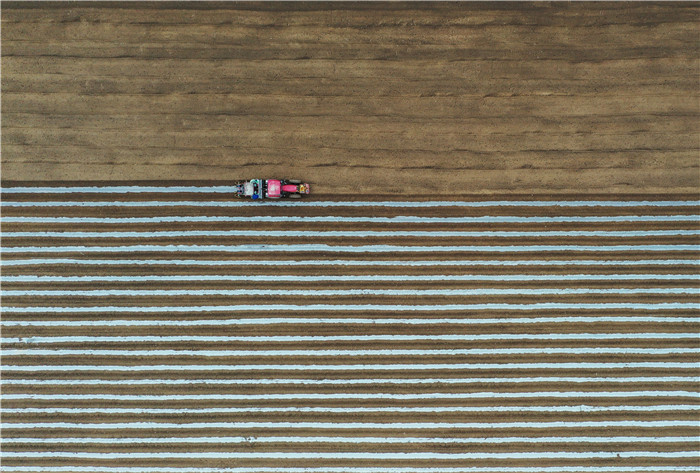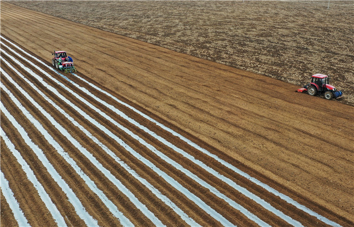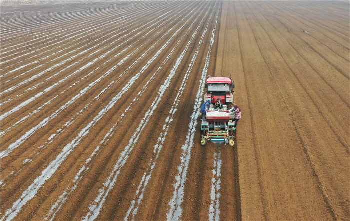 3月11日,河北省唐山市豐南區(qū)小集鎮(zhèn)起莊子村的農(nóng)民在使用機(jī)械設(shè)備播種馬鈴薯(無人機(jī)照片)。