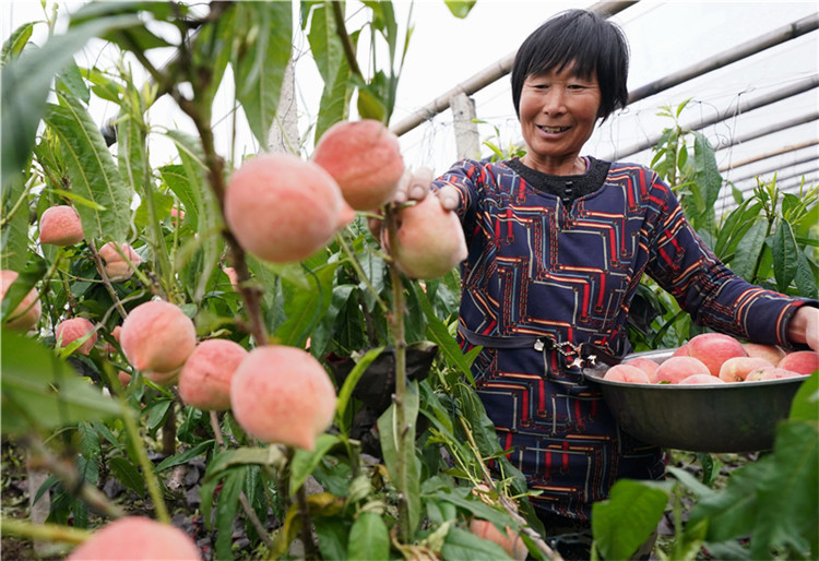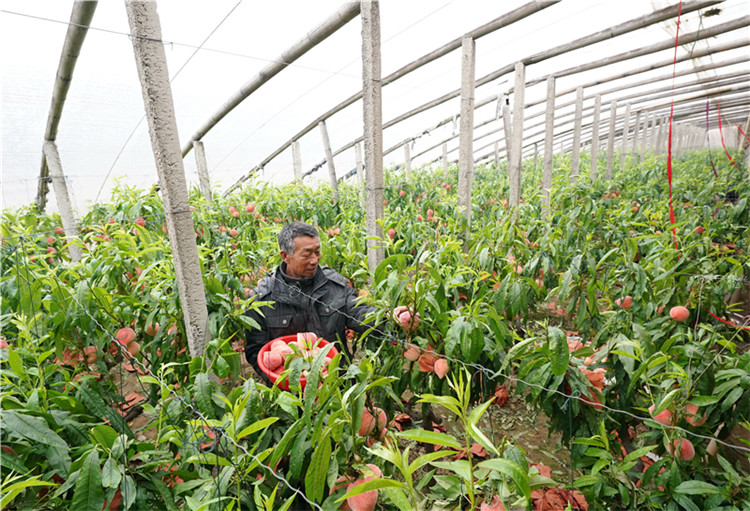 3月18日,樂亭縣新寨鎮(zhèn)大港村一位農(nóng)民在自家大棚內(nèi)采摘鮮桃。