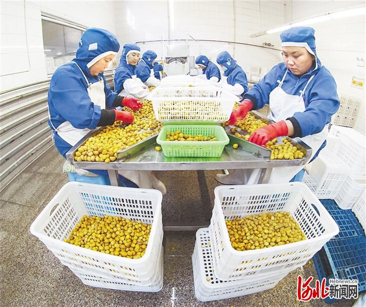 農(nóng)業(yè)龍頭企業(yè)河北美客多食品集團(tuán)股份有限公司板栗仁脫皮車間的工人在加工產(chǎn)品。(河北日?qǐng)?bào)資料片)河北日?qǐng)?bào)通訊員劉滿倉(cāng)攝